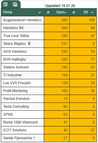 - Felles samling fredag 13. mars 2026, for å spille siste runde over 9 hull! Når alle er ferdigspilt blir det premieutdeling med vandrepokal til beste firma sesongen 25/26